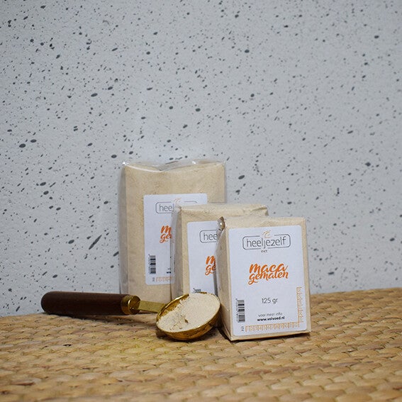 Maca komt van de wortel van de macaplant en is gedroogd en gemalen tot poedervorm. Maca is rijk aan hoogstaande eiwitten en energieverhogend. Het helpt tevens bij het verminderen van stressgevoelens, ondersteunt fysieke en intellectuele prestaties. Daarnaast helpt het ook de hormoonhuishouding te stabiliseren. Dit poeder is te gebruiken als thee, maar is ook te vermengen met ontbijtmout, te gebruiken in smoothies of groentendranken.