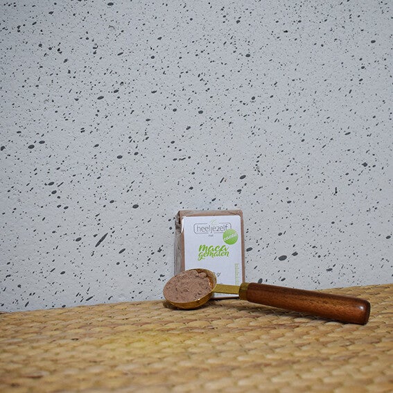 Lepidium meyenii, gekend onder de naam maca en ook wel Peruaanse ginseng genoemd, is een kruidachtige tweejarige plant afkomstig uit het Andesgebergte in Peru. De macawortel wordt voornamelijk in poedervorm aangeboden omwille van zijn geneeskrachtige werking en effect op het voortplantingsstelsel. Maca bevat grote hoeveelheden aan mineralen, vitamine B, enzymen, magnesium en essentiële aminozuren. De Peruviaanse macawortels groeien in drie basiskleuren. Deze kleuren zijn geel, rood en zwart. De cacaoboom (Theobroma cacao) is een boom die wordt geteeld in landen rond de evenaar, en levert cacaobonen, waarvan onder meer chocolade wordt gemaakt. De cacaoboom komt voor tussen 20 graden noorderbreedte en 20 graden zuiderbreedte (binnen de keerkringen), en stelt hoge eisen aan neerslag, temperatuur en bodemvruchtbaarheid. Omdat cacaobomen de volle zon slecht verdragen, wordt deze meestal onder schaduwbomen geteeld. Een cacaoboom kan meer dan 50 jaar oud worden, groeit tot 10 meter hoog en heeft een matig dikke stam. De stam vertakt zich op 1 meter van de grond in maximaal 5 wijd uitstaande hoofdtakken. Deze hoofdtakken vertakken zich verder. De boom heeft een dichte bladerkroon. De bladeren zijn leerachtig. Als de boom vier tot vijf jaar oud is, gaat hij bloeien. De kleine witte of roze bloemen zitten direct op de stam en op de dikke takken; dit verschijnsel heet cauliflorie. Als hij eenmaal is gaan bloeien, bloeit de cacaoboom zonder ophouden vrijwel het hele jaar door. De boom draagt dan ook constant vruchten. Ondanks de lange bloei, levert de cacaoboom maar dertig tot veertig vruchten per jaar. Deze vruchten lijken op langwerpige meloenen. Ze worden geplukt en vervolgens opengebroken. De cacaobonen liggen in het midden van de steenvrucht. Elke vrucht bevat veertig tot vijftig 'bonen', die elk ongeveer een gram wegen. Een gemiddelde cacaoboom levert per jaar dus één tot twee kilogram bonen. De cacaobonen worden, met het vruchtvlees dat er nog aanzit, door schimmels en bacteriën gefermenteerd. Hierbij loopt de temperatuur op tot vijftig graden. Deze fermentatie duurt ongeveer vijf dagen. De kiem van het zaad wordt gedood en de kleur van de bonen verandert van paars naar bruin. Ten slotte worden door het fermenteren de smaakvoorlopers voor de chocoladesmaak gevormd. De bonen worden in de zon gedroogd, of in drooghuizen. De gedroogde bonen worden vervolgens geëxporteerd. Het tot op heden vroegste gebruik van cacao, 5.300 jaar geleden, werd vastgesteld in Santa Ana (La Florida) in zuidoost Ecuador. De cacao is inheems in Midden-Amerika en het noordelijke deel van Zuid-Amerika. De Azteken verbonden cacao met Tlaloc, de god van de regen en de vruchtbaarheid. Zij dronken een cacaodrank, xocoatl(cacaoalt), die vaak op smaak werd gebracht met vanille, chilipeper en honing. Cacaobonen dienden bij de Azteken ook als betaalmiddel. Voor 10 bonen kon een konijn gekocht worden, terwijl men - naar verluidt - een slaaf kon kopen voor 100 bonen. De Spaanse veroveraar Fernando Cortez bracht in 1528 als eerste een grote hoeveelheid cacaobonen naar Europa. In de 17e en 18e eeuw is de cacao aangeplant in Azië, met name in Ceylon, Indonesië en Maleisië. In Zuid-Amerika verspreidde de productie zich tot in Brazilië. Ook in Afrika werden cacaobomen aangeplant, aan de Goudkust (het huidige Ghana). Een vrijgelaten slaaf bracht de bonen in 1879 vanaf een plantage op Fernando Pó over naar zijn geboorteland. Cacaopoeder is afkomstig van de cacaoboon, de vrucht van de cacaoboom. Om cacaopoeder te maken wordt gebruikgemaakt van de cacaomassa van de cacaoboon. Onder hoge druk wordt de massa uitgeperst, zodat er cacaopoeder en -boter ontstaan. Het poeder is in vele verschillende kleuren en smaken te verkrijgen. Die smaak en kleur worden bepaald door de kwaliteit van de cacaoboon en de temperatuur van het roosteren, maar ook door de zuurgraad van de boon. Cacaopoeder wordt gebruikt om er chocolade en chocolademelk van te maken. Verder wordt het ook veel gebruikt als afwerking op warme en koude dranken of nagerechten met chocolade.