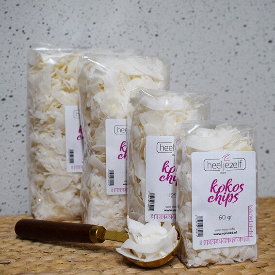 Kokoschips is geschaafd en gedroogd vruchtvlees van de kokosnoot. Het heeft een sterke kokosgeur, is lichtzoet van smaak en heerlijk te gebruiken over ontbijtmout, als garnering op smoothies of te verwerken in een kokostaart. Deze kokoschips komt uit Sri Lanka.