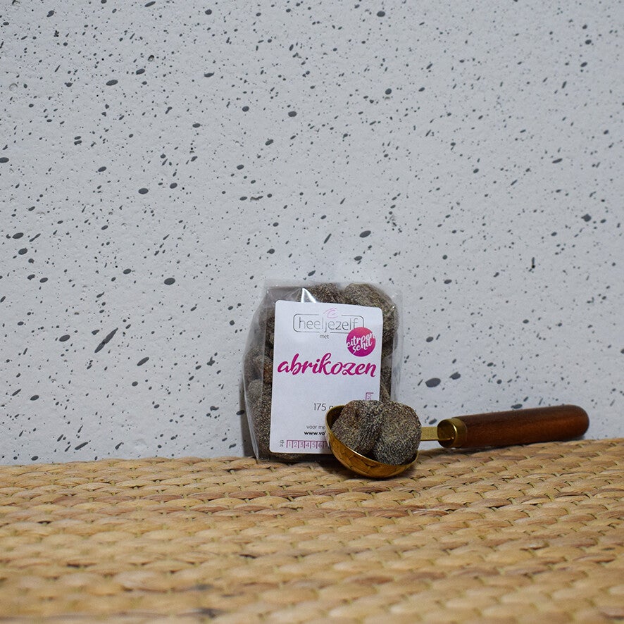 Deze gedroogde en ongezwavelde abrikozen smaken heerlijk zoet en kunnen als simpel tussendoortje genuttigd worden, in smoothies verwerkt worden of bijvoorbeeld tot een chutney gemaakt worden. Deze gedroogde abrikozen komen uit Turkije en zijn door Volvoed besprenkeld met een laagje gemalen citroenschil. Dit geeft een frisse sensatie mee aan de zoete abrikozen. Een ware traktatie!