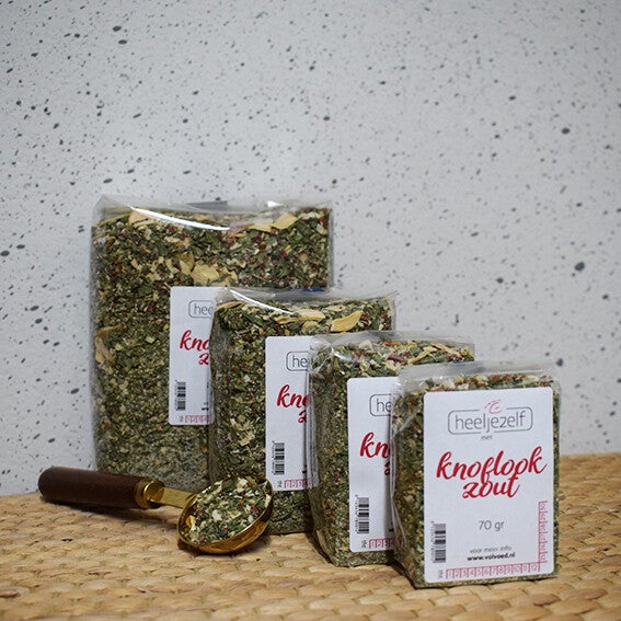 Knoflookzout is een mengsel van zout, knoflookgranulaat, peterselie, uien, paprika, knoflookvlokken en bieslook. Ideaal om je gerechten op smaak te brengen en met kruiden te verrijken. Het mengsel heeft afzonderlijk verschillende landen van herkomst.
