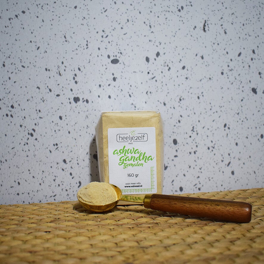 Ashwagandha (Withania somnifera, winterkers of Indische ginseng) is een belangrijk kruid binnen de ayurvedische geneeskunde en wordt al duizenden jaren gebruikt. Van de ashwagandha plant wordt meestal de wortel gebruikt en soms ook het blad. In de wortel zitten de meest belangrijkste werkzame medicinale stoffen; de withanolides. De ashwagandha wortel bevat van alle planten die rijk zijn aan withanolides, de grootste en structureel de meest omvangrijke verzameling withanolides. Withanolides zijn een groep van minstens 300 van nature voorkomende chemische verbindingen die elk hun heilzame functie heeft. Ashwagandha heeft een brede werking, verbetert de conditie van lichaam en geest en draagt bij aan een gezond en lang leven. Het kruid gaat celveroudering tegen, is goed voor denken en geheugen, ondersteunt de glucose- en vetstofwisseling en heeft onder meer stressverlagende, angstremmende, antidepressieve, neuroprotectieve, ontstekingsremmende, immunomodulerende, kankerremmende, antimicrobiële, antioxidatieve, hormoonregulerende en spierversterkende effecten. Deze Ashwagandha komt uit India.