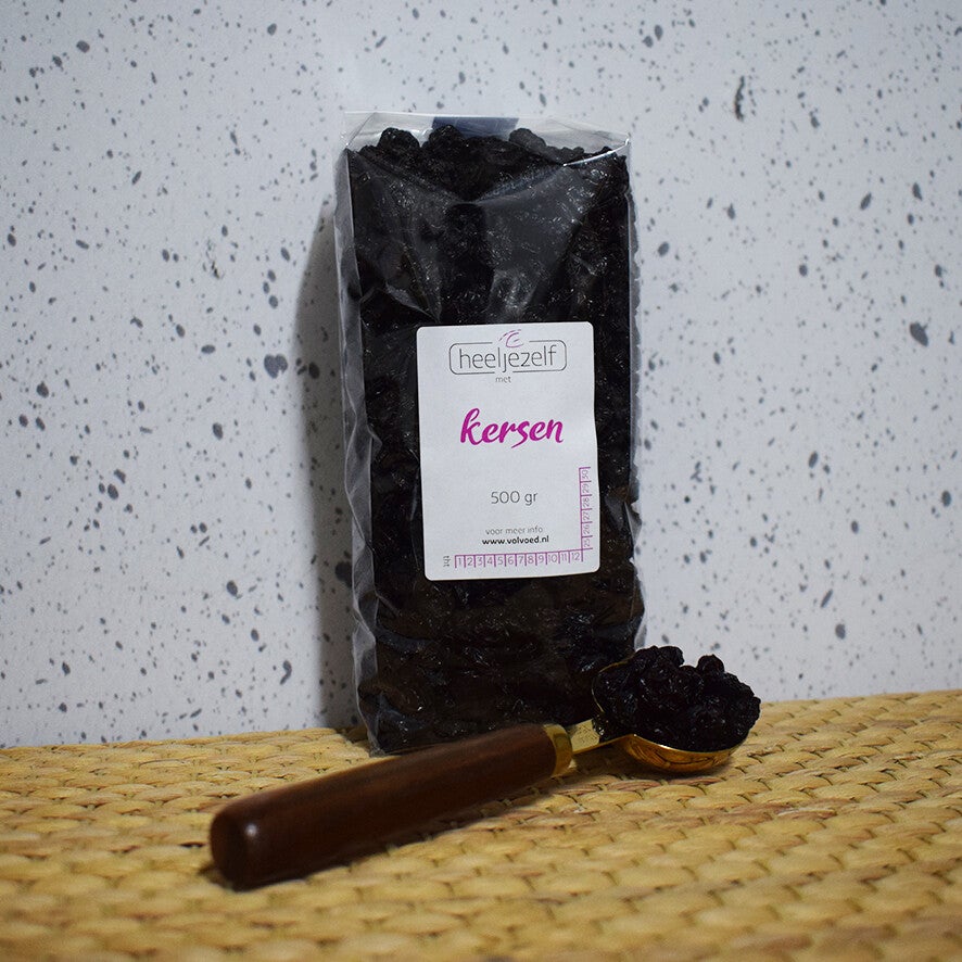 Kersen zijn er in twee varianten; de zoete of tafelkersen (Prunus Avium), de zure kersen (Prunus Cerasus), ook wel krieken genoemd. Dit betreft de laatste variant. Zuur-zoet. Zoete kersen worden meestal uit de hand gegeten, terwijl zure kersen vaak bij het koken en bakken worden gebruikt. Maar de zure kunnen uiteraard ook uit de hand gegeten worden. De kersen worden geplukt, gedroogd, ontpit en daarna met minimale hoeveelheid zonnebloemolie verpakt om ze niet zo aan elkaar te laten plakken. We hebben het hier over 0,1-0,3% van het totaalgewicht aan kersen. Doordat de kersen zongedroogd worden, behouden ze hun vitamines en mineralen en geven ze een smaaksensatie in de mond. Kersen bevatten tal van vitamines zoals vitamine C en B-vitaminen. Bovendien bevatten ze weinig calorieën omdat ze voor ongeveer 85 procent uit water bestaan. Vooral belangrijk voor zwangere vrouwen: kersen bevatten ook foliumzuur (vitamine B11). Deze vitamine is nodig voor de groei en goede werking van het lichaam, en voor de ontwikkeling van het ongeboren kind. Het is ook belangrijk voor de bloedvorming en celdeling. Bovendien zitten kersen boordevol mineralen, waaronder calcium, kalium, fosfor, ijzer en magnesium. Kersen bevatten veel melatonine, wat je nodig hebt voor een gezonde slaap. Dit hormoon is verantwoordelijk voor het dag-nachtritme van je lichaam en helpt je om ‘s avonds te ontspannen en overdag wakker te blijven. Er zijn onderzoeken die zeggen dat slechts een handvol zure kersen een paar uur voor het slapengaan je kan helpen beter te slapen. Kersen verlagen het urinezuurgehalte. Te hoge urinezuurspiegels treden op wanneer het lichaam te veel urinezuur aanmaakt of als er te weinig via de nieren wordt uitgescheiden. Je lichaam kan te veel urinezuur aanmaken door versnelde celafbraak. Dat is bijvoorbeeld het geval bij zeldzame stofwisselingsziekten, psoriasis, kanker, chemotherapie, overgewicht (obesitas) en alcoholgebruik. Wat onschuldig klinkt, kan echter leiden tot ernstige gezondheidsproblemen: jicht is een van de vele ziekten die veroorzaakt kunnen worden door een te hoog urinezuurgehalte. Maar ook nierstenen, hoge bloeddruk en hart- en vaatziekten kunnen veroorzaakt worden door een verhoogd urinezuurgehalte. Kersen kunnen, evenals donkere bessen, het urinezuurgehalte helpen verlagen.